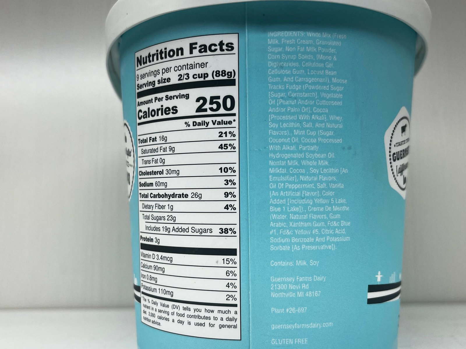 McGuire’s Irish Mint ice cream is made with mint ice cream, streaks of fudge, and dark chocolate mint cups. It’s sold in 1.5 quart (48 oz.) or 3 gallon bulk size.